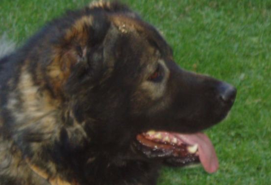 más bajo va a dar una impresión más compacta y proporcionada. Onso por su mayor altura y hueso, es un perro más pesado, Onso suele oscilar entre 63 y 68kg y Graf suele estar entre 58 y 62kg. Lógicamente en invierno comen más y están más pesados y en verano comen menos y bajan bastante de peso, más en un clima como el de Zaragoza con un verano muy caluroso. En general no tienen gran tendencia a engordar, ya que son perros muy activos, en el caso de Graf hiperactivo. Realmente si quisiera conseguirles un peso más espectacular, me sería fácil encerrándoles más horas en la perrera y cebándolos más de pienso. Pero buscar un Onso de 80kg y un Graf de 70kg creo que no tienen ningún sentido, están mucho mejor así. El pelaje es claramente más largo en el caso de Onso. En cuanto a su colorido me gustan los dos, me gusta especialmente las patas atigradas de Onso y pecho y patas blancas de Graf. Incluso su textura es diferente y su período de cambio de pelo también. En cuanto a la cabeza, Onso claramente es un perro con más cabeza. Graf tiene una cabeza más fina y lobuna. Esto va por gustos, a mi me gusta el tipo georgiano con cabeza similar a un oso al que se acercaría relativamente Onso, incluso me gustan aún más cabezones que Onso siempre que no se pasen de belfo y babeen. Hay gente a los que les gusta una cabeza más pequeña, por ejemplo mi amigo Josu que dice que le gusta una cabeza tipo como la de Graf, más fina. Repito que es cuestión de gustos, es como plantear ¿te gusta más la cabeza del mastín o del montaña del Pirineo? A mi las dos me parecen bonitas, va por gustos. Pero lo que es importante es que los dos tienen el stop correcto, ojos marrones oscuros pequeños y ovalados como marca el estándar y sobretodo expresión y mirada inequívocamente de Cáucaso. En cuanto a la dentadura, los dos tienen el cierre perfecto en tijera y dientes fuertes y sanos. Graf tiene buenos piños pero en este caso le supera claramente Onso, que tiene unos colmillos impresionantes, mayores a los de casi cualquier perro que conozca.